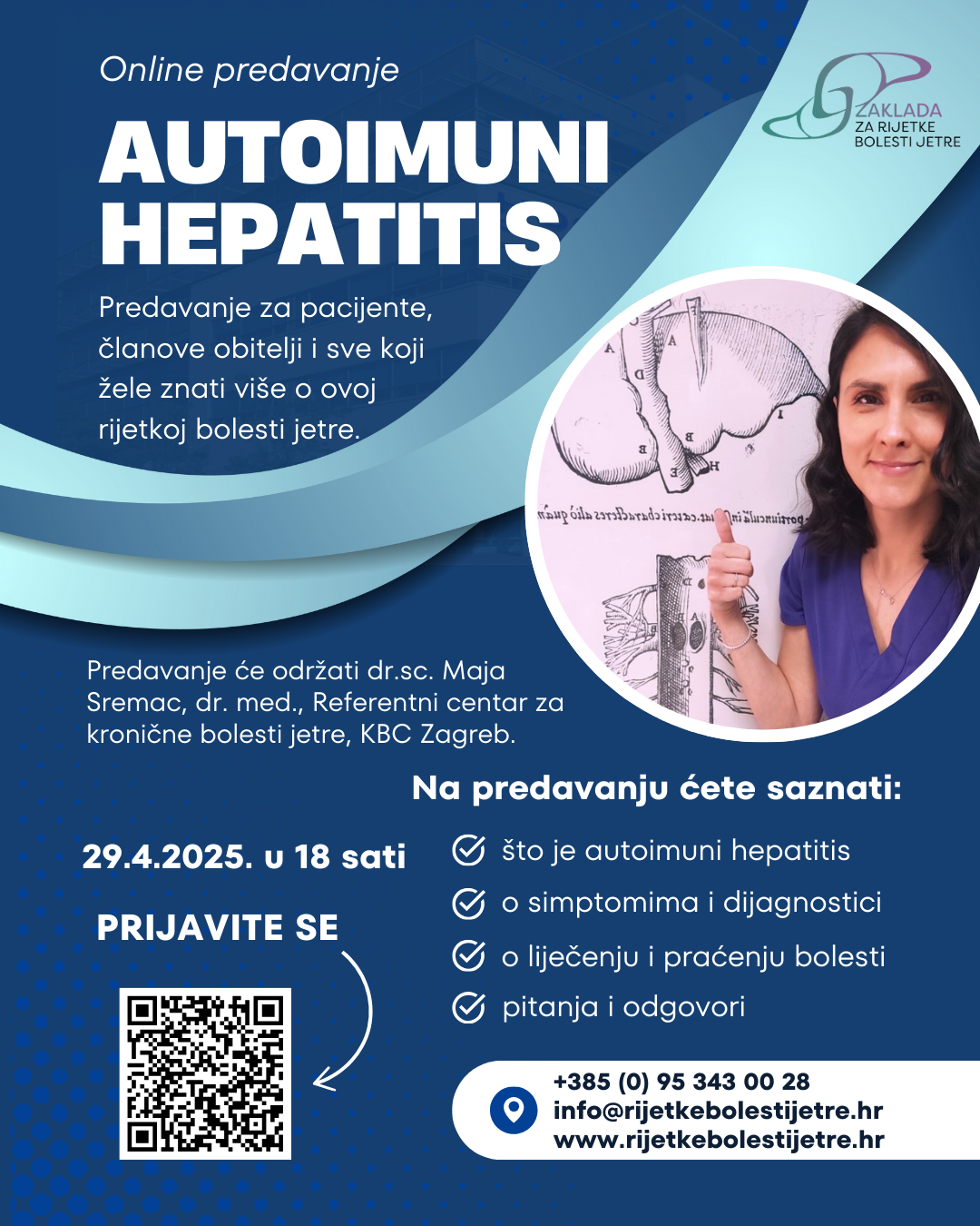 POZIV NA ONLINE PREDAVANJE: Autoimuni hepatitis Pozivamo vas na online predavanje “Autoimuni hepatitis” koje će održati dr. sc. Maja Sremac, dr. med, specijalistica gastroenterologije i hepatologije iz Referentnog centra za kronične bolesti jetre, Zavoda za gastroenterologiju i hepatologiju KBC-a Zagreb. 📅 Datum: 29.4.2025.🕖 Vrijeme: 18 sati💻 Platforma: Zoom (link za pristup predavanju bit će poslan … Nastavi čitati Online predavanje ”Autoimuni hepatitis”